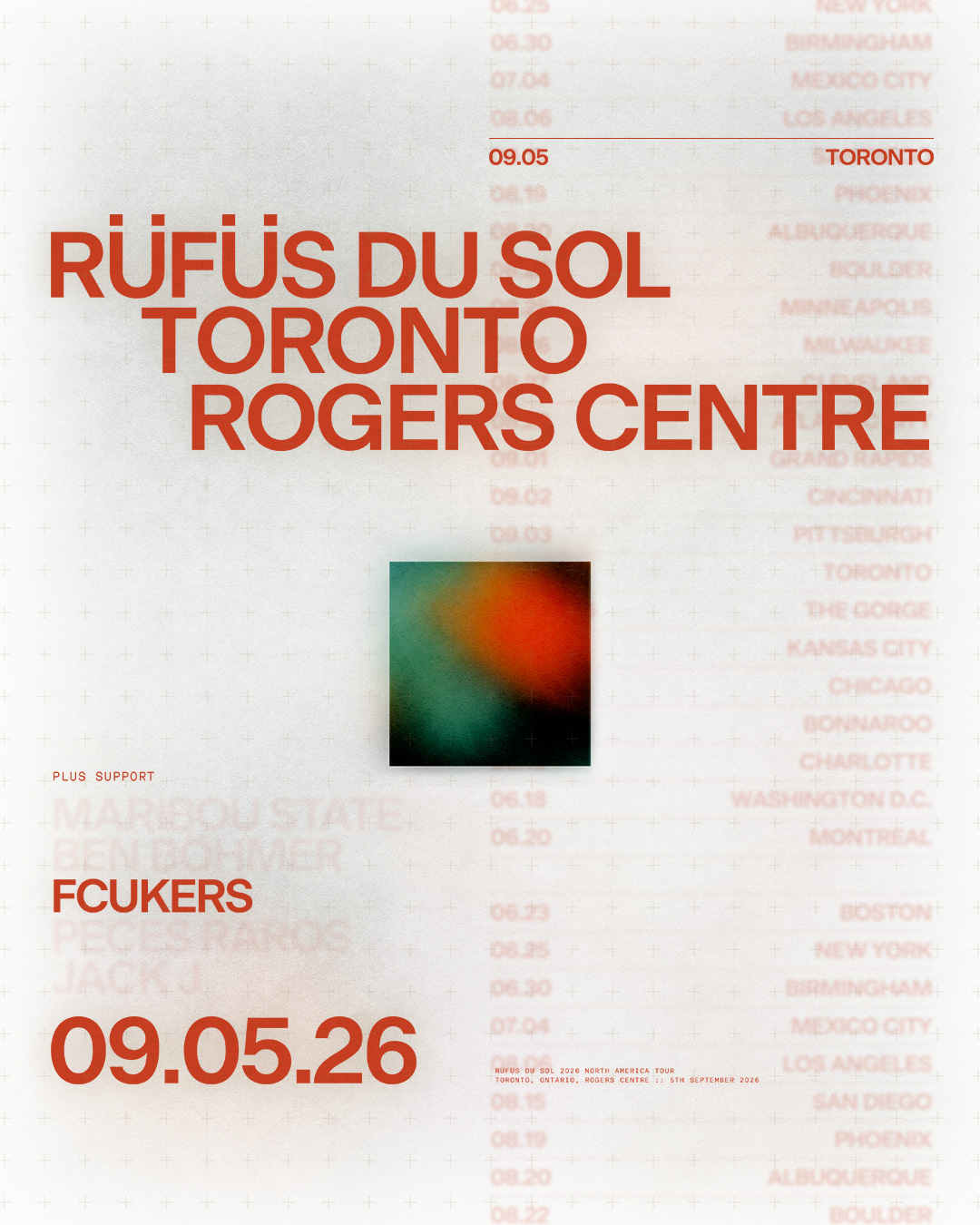Sep 05 Rüfüs Du Sol Rogers Centre Rüfüs Du Sol With: FCUKERS Date: September 05, 2026 Venue: Rogers Centre Location: 1 Blue Jays Way, Toronto, ON, Canada Time: 7:30 PM Ages: All Ages Buy Now Purchase Tickets From These Selected RetailersTicketmasterRSVP More Info Related No related events.